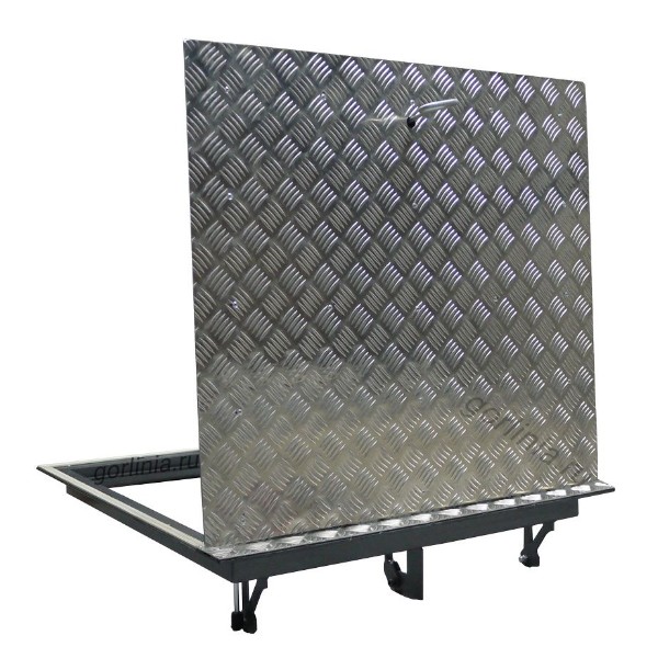 Напольные люки с внешней отделкой алюминиевым рифленым листом на стальном каркасе со скрытым подъемным механизмом на петлях и газовых амортизаторах в финишные бетонно-полимерные полы в гараже под проход людей без наезда авто.