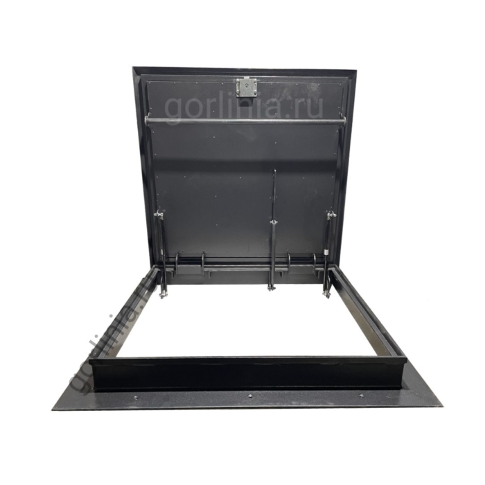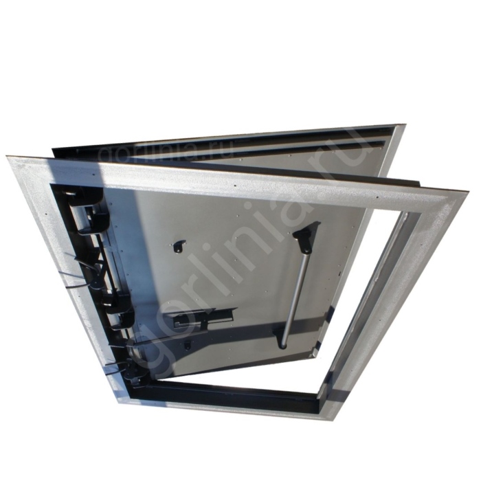 Откидная квадратная крышка зашита сверху гладким кровельным листом 2 мм с загнутыми книзу краями, вылетающими на 25 мм за периметр коробки. Внутри каркаса створки между ребрами обвязки проложен рулонный минеральный утеплитель 50 мм, подшитый снизу сталью 1 мм.