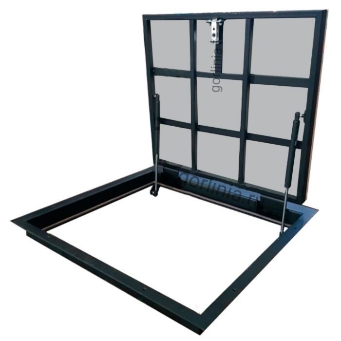 Конструкция смещенного за ось открывания узла шарнира позволяет изготовителю сформировать опорную поверхность по стороне петли 800, сохранив при этом ширину лаза 800 для устройства лаза в погреб с приставной лестницей.